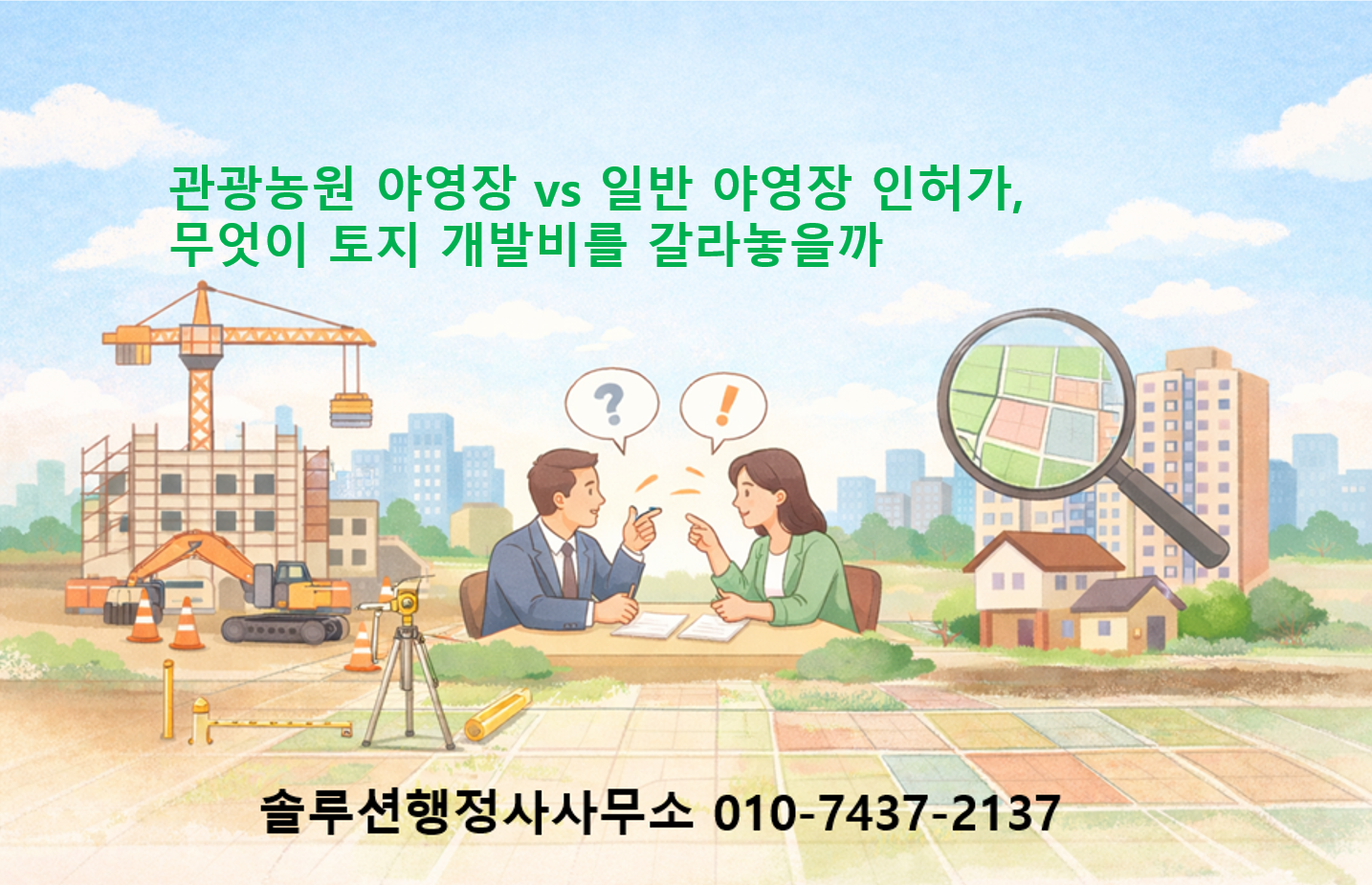 관광농원 안에 야영장을 넣는 방식과 일반 야영장 조성은 겉보기엔 비슷하지만, 실제로는 부담금·자금조달·부대시설 계획에서 차이가 납니다. 어떤 땅에서 어느 방식이 더 유리한지 실무 기준으로 정리합니다.