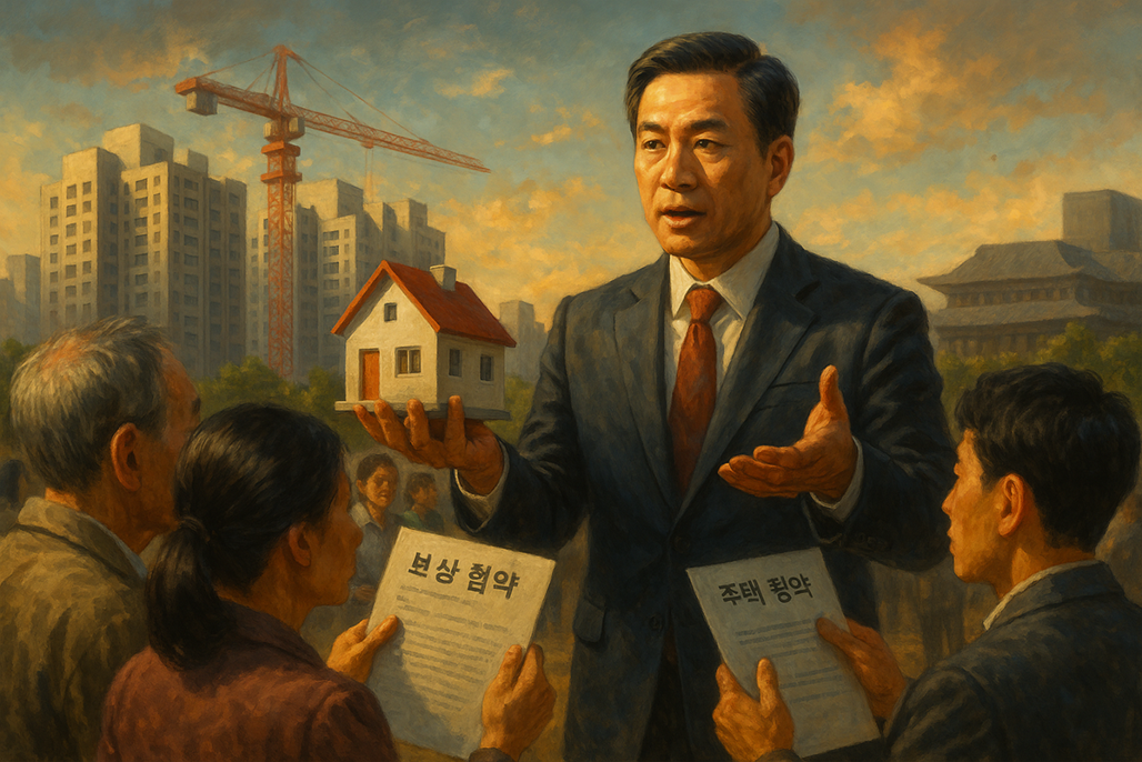 정부 인사가 주택 모형을 들고 주민들에게 보상·청약 대책을 설명하는 이미지 / 출처: 작성자 직접 제작(AI 생성), 저작권 보유 © 2025