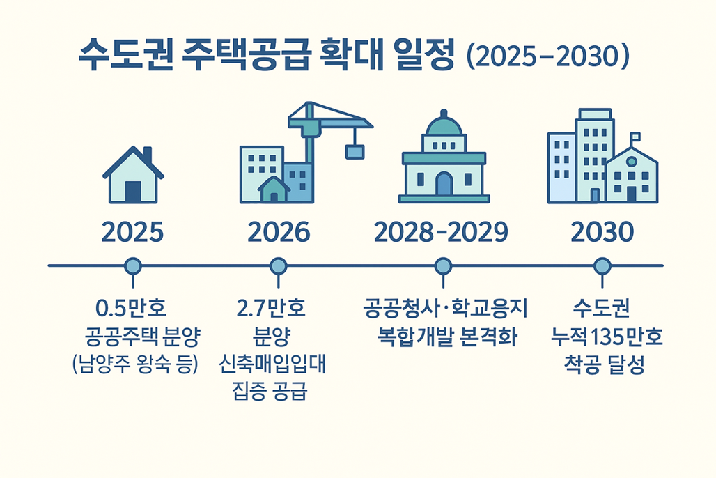 수도권 주택공급 확대 일정(2025-2030) 인포그래픽 / 출처: 작성자 직접 제작(AI 생성), 저작권 보유 © 2025